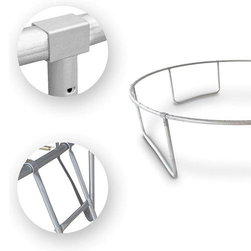 Стойкую и прочную конструкцию создают закругленная рама, обеспечивающая оптимальное натяжение сетки, и двойные U-образные ножки. Профилированные металлические стойки, из которых состоит конструкция батута, покрытые мягким поролоном, что повышает безопасность детских игр. Широкий вход и стремянка с 2 ступенями, входящими в комплект, обеспечивают легкий доступ детей к батуту. Также вход можно закрыть, чтобы ребенок не попал на батут без разрешения родителей.