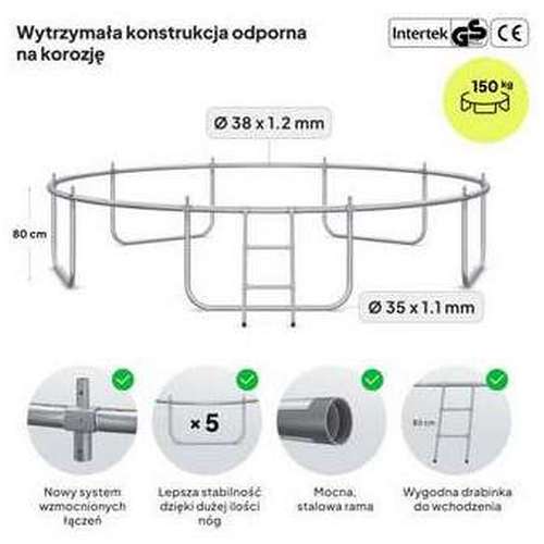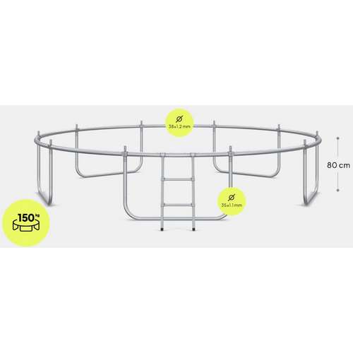 Каркас батута сделан из оцинкованной стали для защиты элементов от погодных условий. Трубы рамы имеют диаметр 38 мм и толщину стенки 1,2 мм.