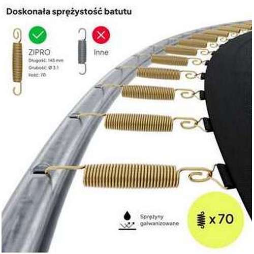 Батут ZIPRO JumpPro построен с использованием 70 плотно скрученных пружин длиной 145 мм, изготовленных из проволоки толщиной 3,1 мм. Правильное количество и расположение обеспечивает сильный отскок и очень хорошую амортизацию во время приземления.