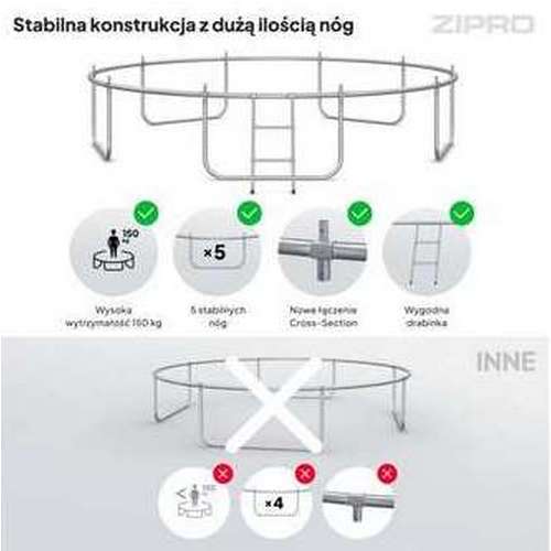 Батуты ZIPRO отличаются усовершенствованной крепежной системой, в которой элемент CROSS-SECTION соединяет раму с ножками и стойками сетки. Точки соединения, подвергающиеся наибольшим нагрузкам, соединяются саморезами, что обеспечивает дополнительное усиление. Эта инновация обеспечивает более динамичную и эффективную работу, что приводит к повышению производительности и простоте установки.