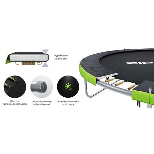 В батуте ZIPRO JumpPro PREMIUM пружины расположены вне сетки, поэтому поверхность для скачков остается полностью отделенной от них. Это решение, повышающее безопасность.