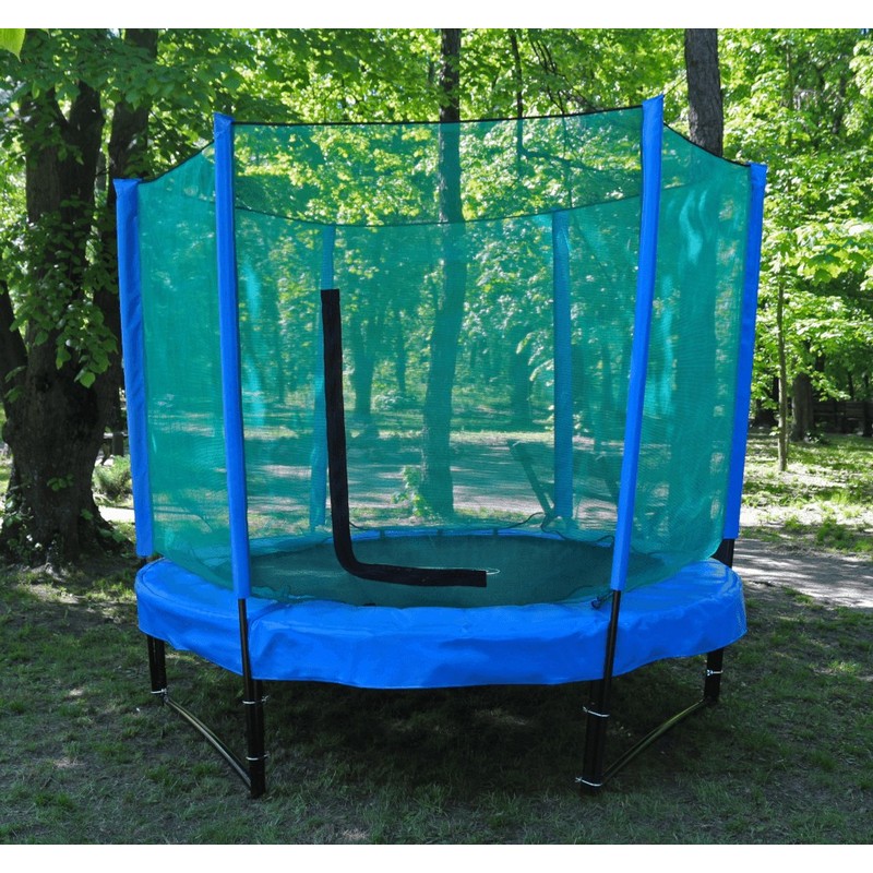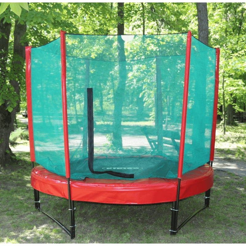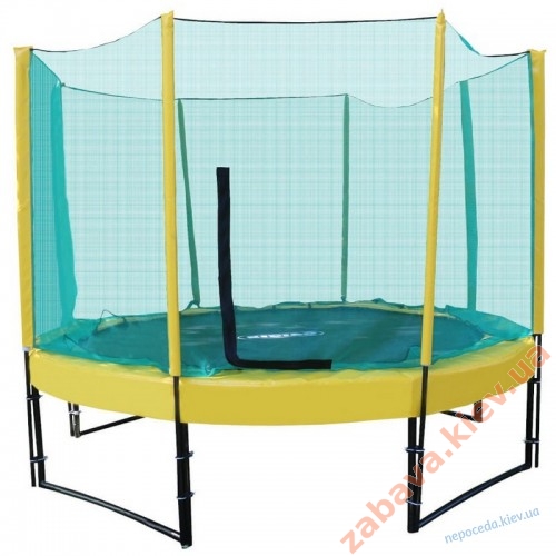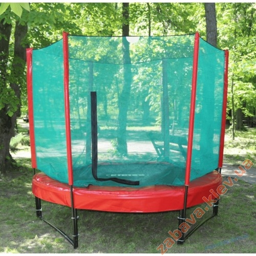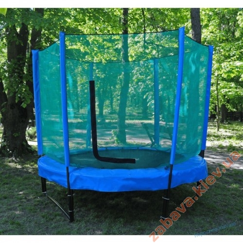 Стойки защитной сетки выполнены из ПВХ ткани и наполненны вспененным материалом из полиэтилена, что позволяет избежать травм и повреждений после контакта с металлическими деталями защитной сетки батута.
