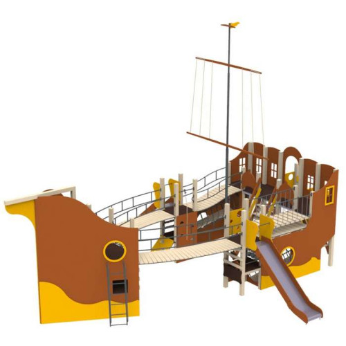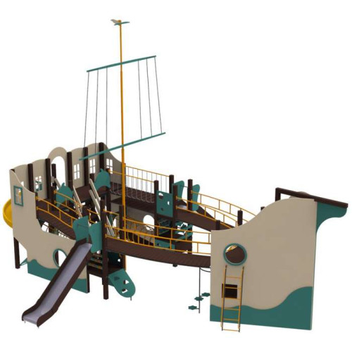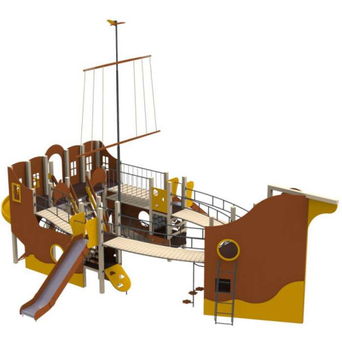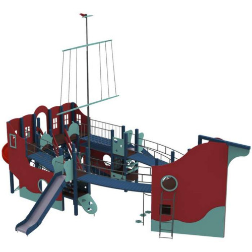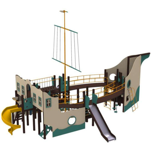 Многофункциональный детский комплекс состоит из конструкции в виде корабля со стенкой для скалолазания, вертикальных лазалок, металической горки и пластиковой горки-спирали.