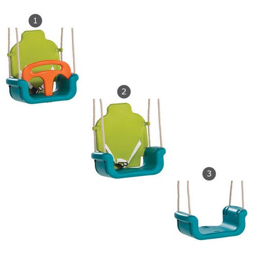 Сиденье растет вместе с ребенком, превращаясь из детского сиденья в обычное сиденье. Более того, спинка может переключаться между двумя позициями. Качели имеют защитный ремень с застежкой, которая надежно закрепляется при закрытии.