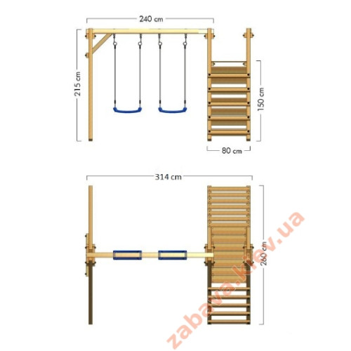 Детские качели уличные со скалозкой и лесенкой для подъема. Наличие двух подвесных качелей, небольшой скалолазки и лесенки делают из детской качели мини-площадку, на которой может играть и веселиться целая детская компания. Одни детки могут кататься на качелях, другие играть на скалолазке, лесенке. Площадка между лесенкой и скалолазкой позволяет превратить качель в неприступный замок, вершину горы или пункт наблюдения.
