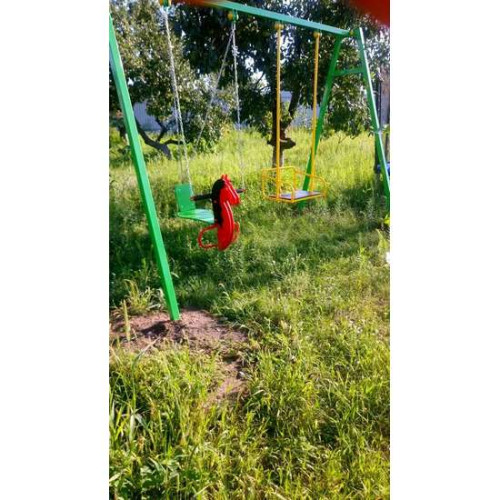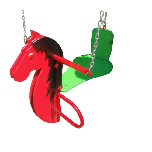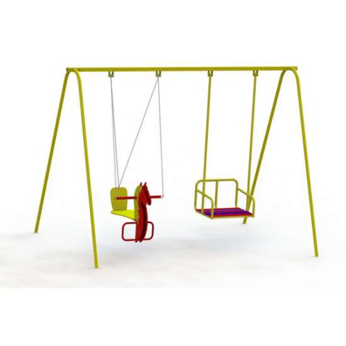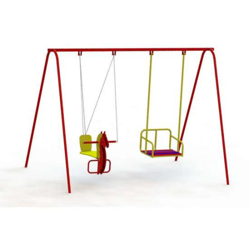 Крепкие качели для детской игровой площадки в себя вмещают два места: Стандартная люлька со спинкой на жёстком подвесе и лошадка на цепях.
