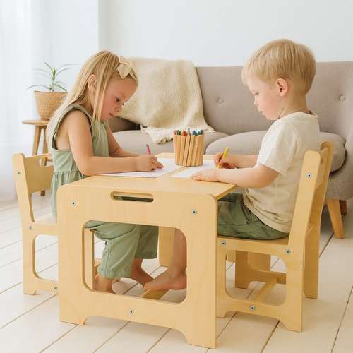 Набор детской мебели Комфорт включает удобный стол и два эргономичных стульчика, изготовленных из натуральной фанеры. Минималистичный дизайн с закругленными краями делает мебель безопасной для детей, а надежная конструкция обеспечивает устойчивость и долговечность. Благодаря легким ручкам-переноскам в спинках стульев и на столе комплект легко переставлять в любое место комнаты. Идеально подходит для обучения, рисования, творчества и семейных занятий.Размеры (В×Ш×Г):