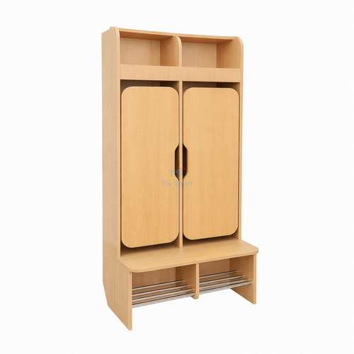 Каждое отделение имеет закрытую дверцу, что помогает поддерживать опрятный вид раздевалки. Верхние открытые ниши подходят для хранения головных уборов или сменных вещей. Нижняя часть оборудована металлическими перекладинами для размещения обуви. Закругленные формы и вырезы-ручки делают шкаф безопасным и удобным для детей.