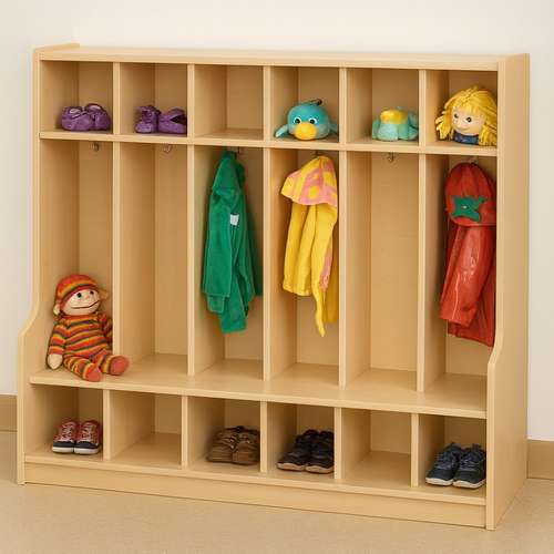 Удобный и вместительный детский шкаф со многими отделениями создан специально для организованного хранения одежды, обуви и личных вещей детей. Изготовлен из фанеры высокого качества, она сочетает надежность, долговечность и безопасный дизайн. Каждое отделение оборудовано крючками и полками, что обеспечивает порядок и легкий доступ для детей.Размеры – 150×37×130 см