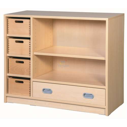 Функциональная тумба с открытыми полками, выдвижным ящиком и четырьмя крепкими контейнерами из фанеры. Идеально подходит для хранения книг, канцелярии, дидактических материалов и игрушек. Компактный размер обеспечивает удобное расположение в классе или в детской комнате.Характеристики: