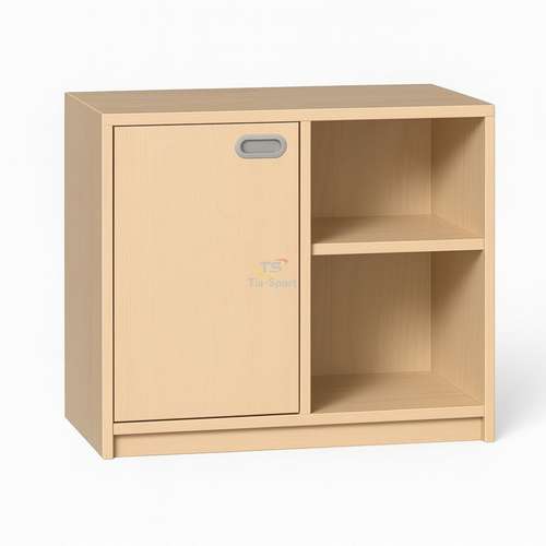 Тумба сочетает закрытый отсек с распашной дверцей и две открытые полки для удобного хранения учебных материалов, игрушек или методических средств. Благодаря оптимальной высоте мебель доступна детям, способствуя развитию самостоятельности и порядка.