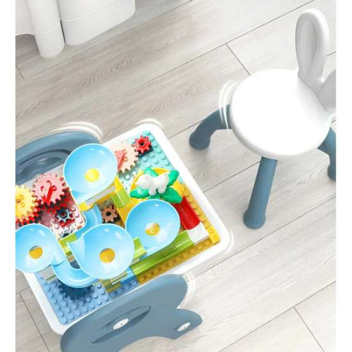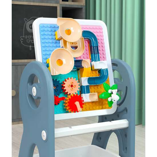 Парта-мольберт "Bunny" оснащена креслом, конструктором, отсеком для игрушек, мольбертом и книжной полкой.