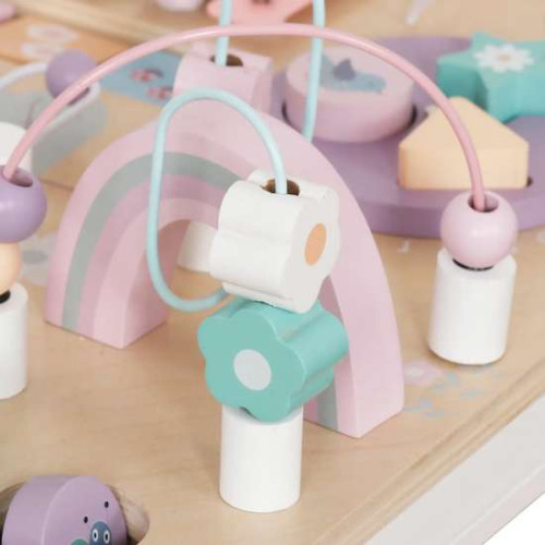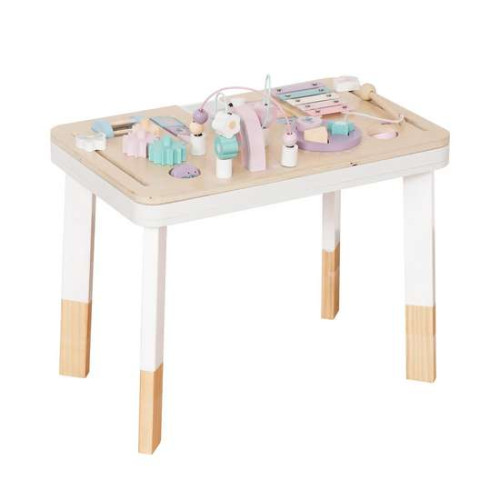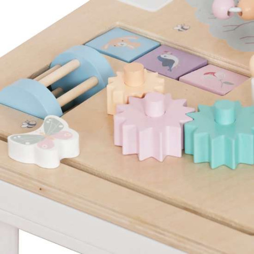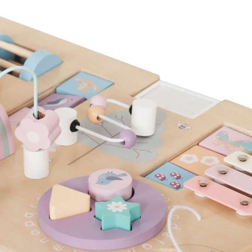 На столешнице расположены ползунки, подвижные кубики-пазлы, шестерни, сортировщик фигур, тарелки и лабиринты с разноцветными бусинами. Верх можно снять, что позволяет использовать стол для рисования, обучения письму и другим творческим занятиям. Пастельные тона позволяют столу вписаться в любой детский интерьер. Высота мебели идеально отвечает потребностям самых маленьких. Деревянный интерактивный стол – это инвестиция в безопасность и долговечность на долгие годы.