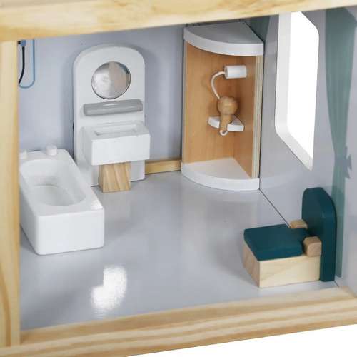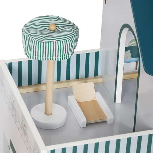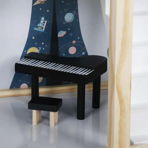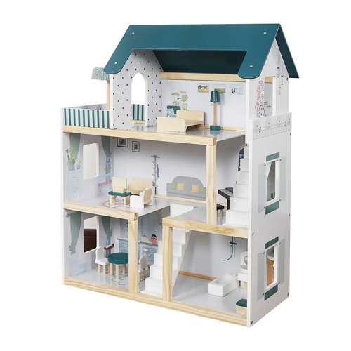 Весь дом сделан из качественного дерева, гарантирующего удовольствие на долгие годы. На первом этаже санузел и кухня. На втором этаже большая гостиная. На третьем этаже вы найдете спальню для куклы с выходом на террасу. Такое расположение комнат дает неограниченные возможности для развлечения.