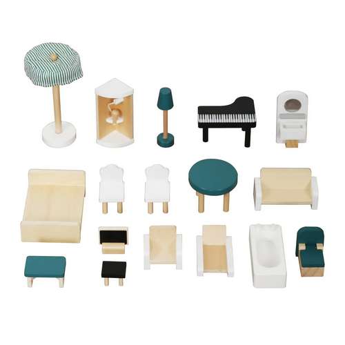 - Набор из 16 деревянных предметов - Стол + 2 стулья, Кровать, Шкаф, Туалет, Диван, Кресло, Рояль, Шезлонг, Душ, Раковина, Табурет, Столик с ТВ, Лампа, Зонтик