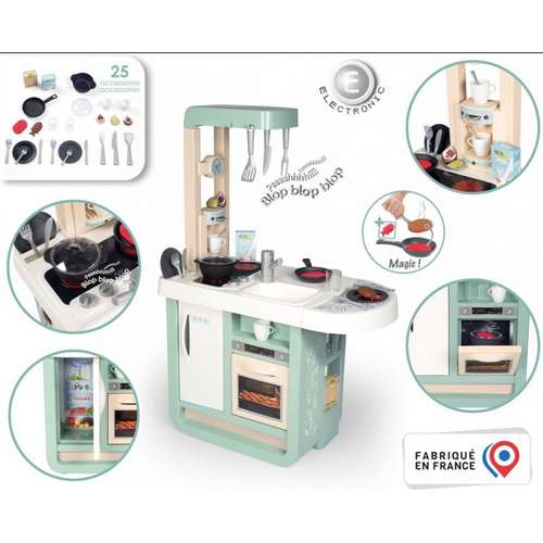 - детская интерактивная кухня выполнена в современном дизайне и в приятных пастельных цветах