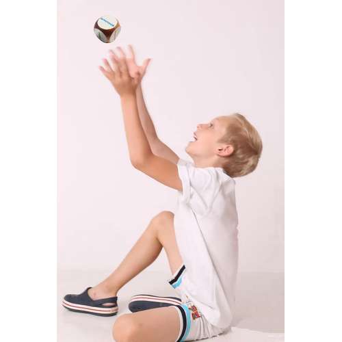 Размер 4х4х4см, ребра закруглены настолько, что каждая из 6-ти граней представляет собой круг диаметром 4см – это обеспечит катание и удобство для детской ладони.