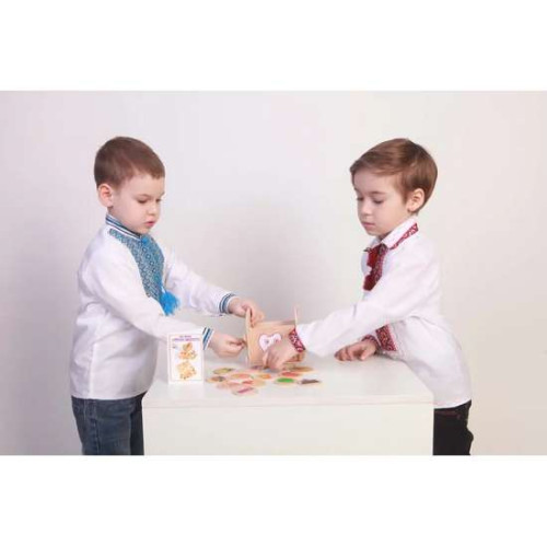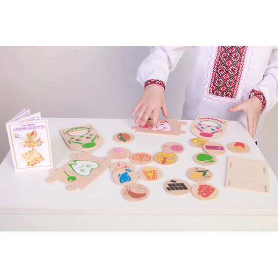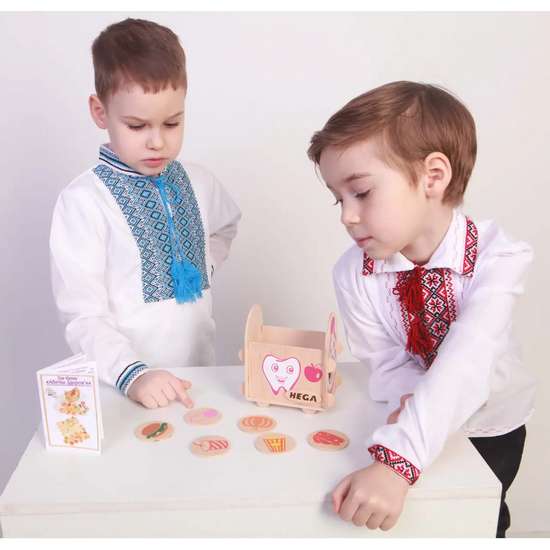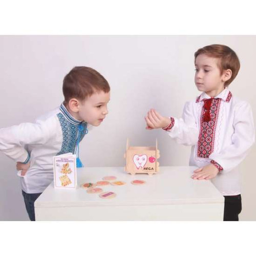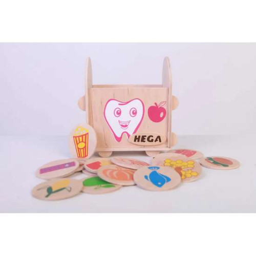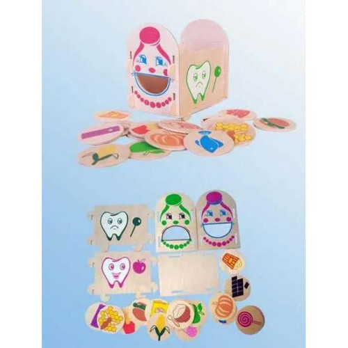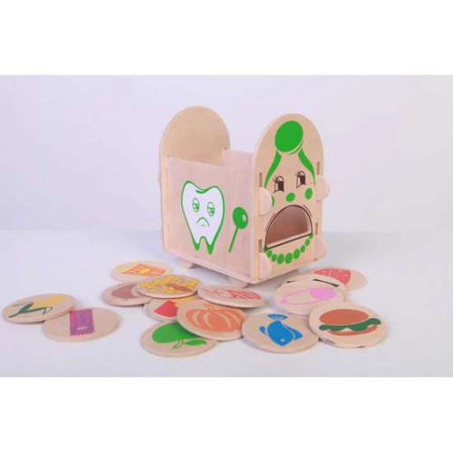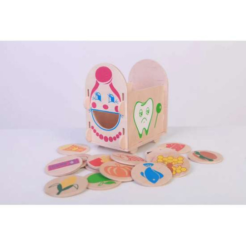 В книге сказка о питании и зубках. Фишки яркие с разной полезной и не полезной пищей.