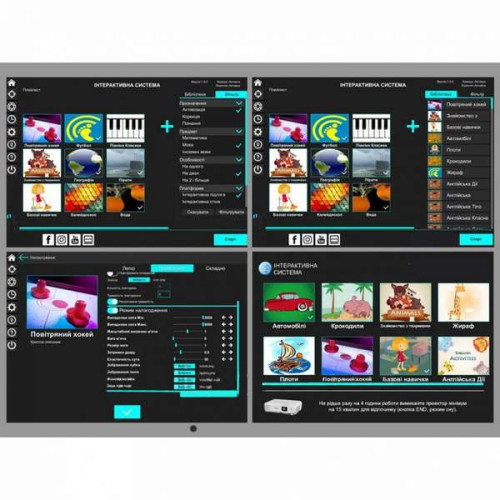 Украинское интерактивное программное обеспечение: не менее 150 интерактивных игр, в том числе на «Активизацию» «Коррекцию», «На развитие психических процессов: внимания, концентрации, памяти» – 34 интерактивных игрі; на "Познания" - 116 интерактивных игр («Основы программирования», «Математика», «Украинский язык», «Английский язык, «Безопасность жизнедеятельности, «Дополнительный Английский», «Логопедия» и др.)