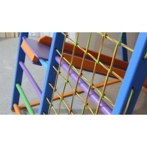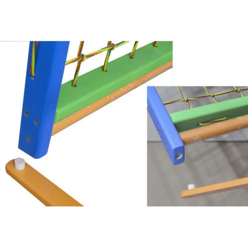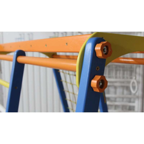Детский комплекс изготовлен из массива сосны высокого качества, все детали тщательно обработаны и не содержат шероховатости, покрытые несколькими слоями безопасного лака без запаха, что увеличивает срок службы спорткомплекса. Все видимые винты закрыты заглушками. Детский комплекс занимает площадь всего 1,5 кв.м.