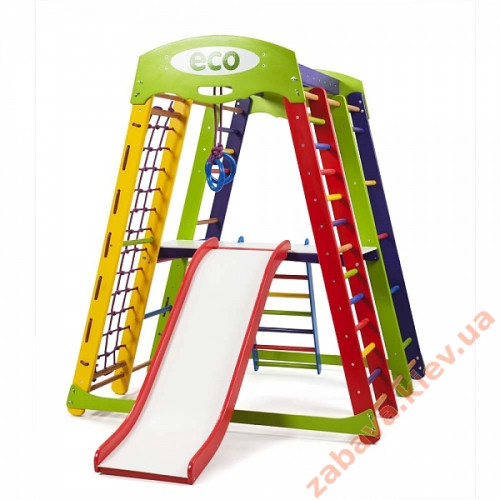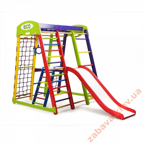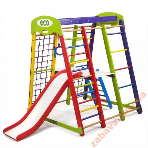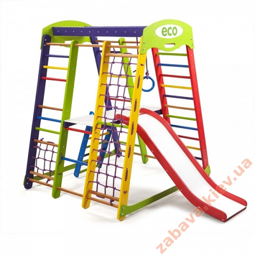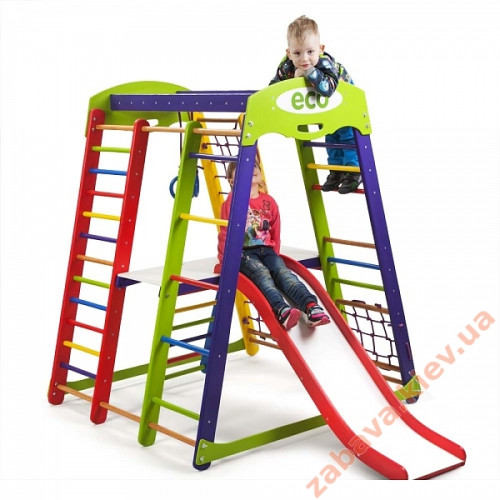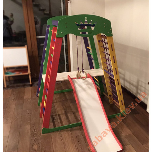 Расширенная модель с удобным мостиком перед горкой. Это детский деревянный спортивный комплекс для дома со ступенями и горкой. Складывающаяся конструкция. Детям скучно на таком тренажёре не бывает. Во время игры укрепляются мышцы ребёнка, энергия направлена на улучшение здоровья. Популярный вариант для младшего возраста.