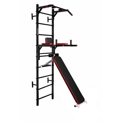 Металлическая шведская стенка №4 черная с турником, брусьями и лавой для жима