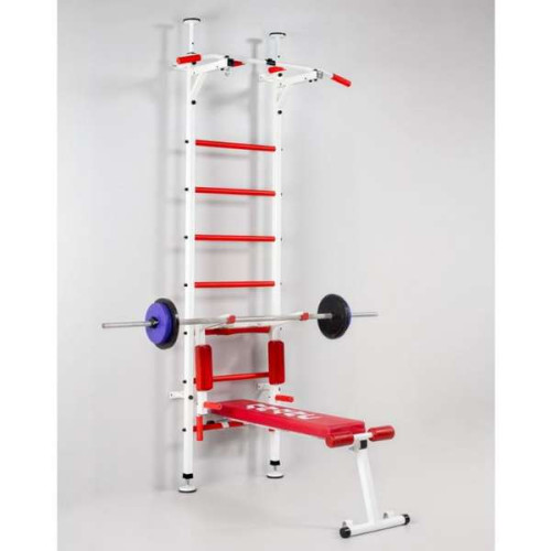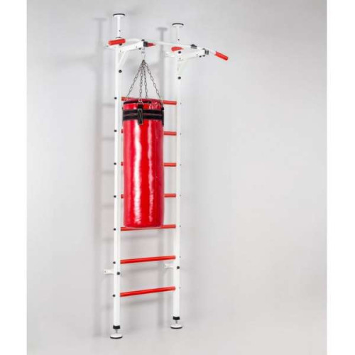 Шведская стенка Торнадо – основным преимуществом является наличие кольца для груши. Комплект поставки включает в себя брусья с подлокотниками и спинкой из полиуретана, перекладину, усиленную металлическими вставками которые расположены под наклоном в 45 градусов, это дает возможность совершать удары по боксерскому мешку с любой силой, скамейку, поверхность которой выполнена из поролона покрытого кожзамом.Технические характеристики: