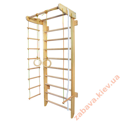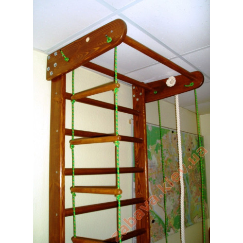 Спортивный уголок изготовлен из массива сосны высокого качества, все детали тщательно обработаны и не содержат шороховатостей, покрыты несколькими слоями безопасного лака без запаха, что увеличивает срок службы спорткомплекса, все видимые винты закрыты заглушками. Применение буковых перекладин позволяет выдерживать нагрузку до 120 кг. Расположение элементов веревочного набора возможно как с правой, так и с левой стороны.