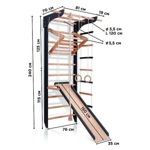 Шведская стенка черная из натурального дерева 9-Lux 3-240 с горкой и навесным турником