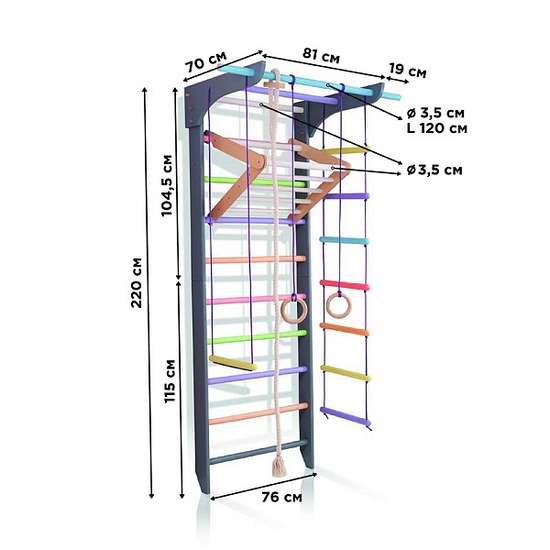 Все детали тщательно обработаны и покрыты несколькими слоями безопасного прозрачного лака, что увеличивает срок службы шведской стенки, все видимые винты закрыты заглушками. Размещение элементов веревочного набора возможно как с правой, так и с левой стороны.