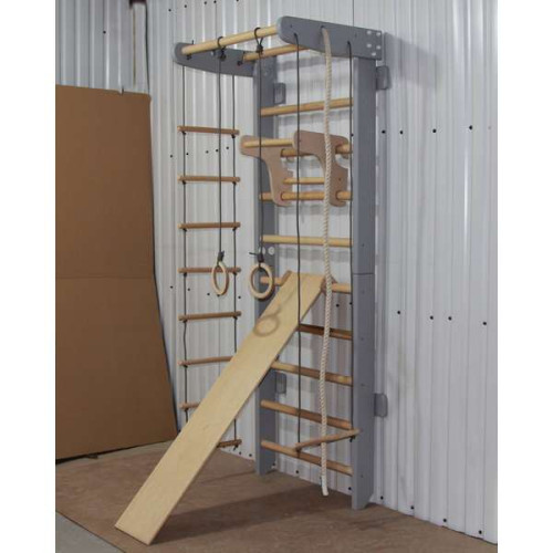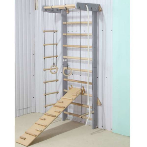 Детский спортивный уголок Серо-лак с веревочным набором, навесным турником и доской, разборные стойки можно купить высотой 210 см, 225 см или 240 см. Спортивный уголок для детей – это самый лучший подарок для Вашего ребенка! Спортивный уголок на основе шведской стенки – изобретение, полностью соответствующее выражению "все гениальное – просто".