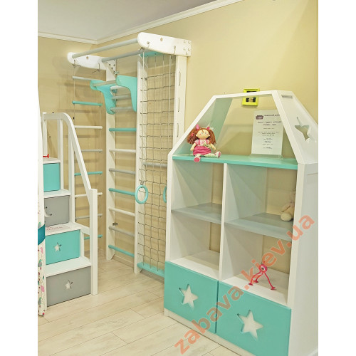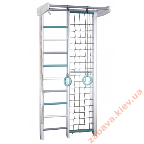 Белая шведская стенка с серыми, белыми и бирюзовыми перекладинами.