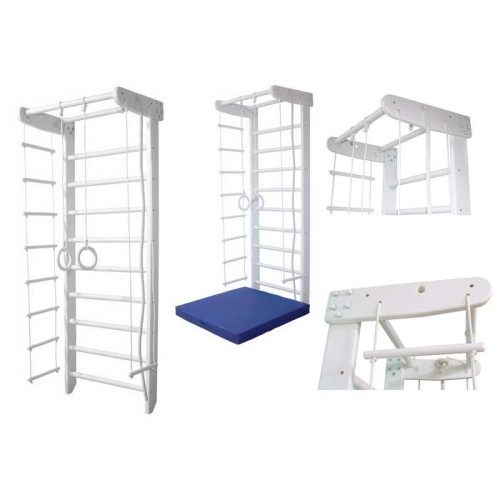 Купить шведскую стенку можна высотой 210 см, 225 см или 240 см. Шведская стенка УМКА с веревочным набором. В комплект веревочного набора входит 4 предмета: веревочная лесенка, гимнастические кольца (фанера, не пластик!), трапеция-качелька, канат. Цвет комплекса: белый. Цвет веревочного набора и веревки - белый. На выбор можно купить спортивный комлекс с синей веревкой.