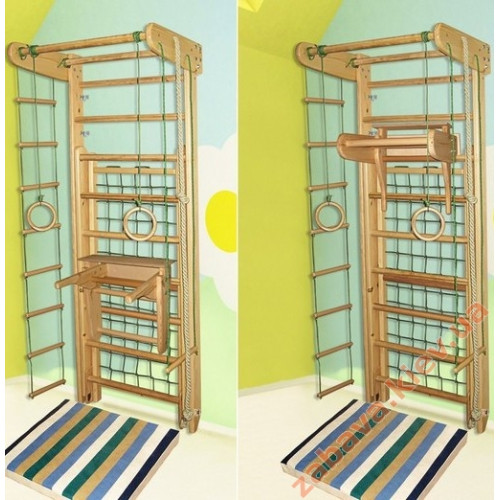 Спортивный уголок-трансформер используется в двух положениях: в сложенном виде он представляет собой стандартную шведскую стенку, а раскладывающаяся нижняя часть превращает его в комплекс с рукоходом и гладиаторской сеткой для лазания. Процесс сборки и разборки предельно простой и занимает не более 1 минуты. Этот спортивный уголок является оптимальным решением, как наиболее функциональный и компактный.