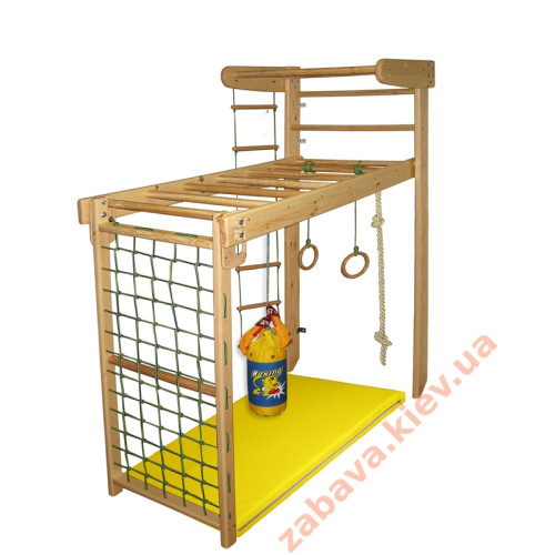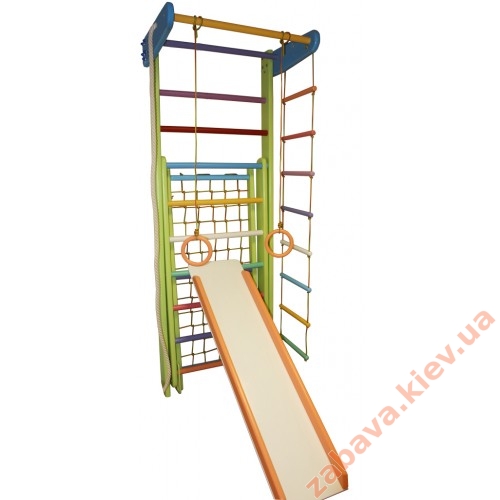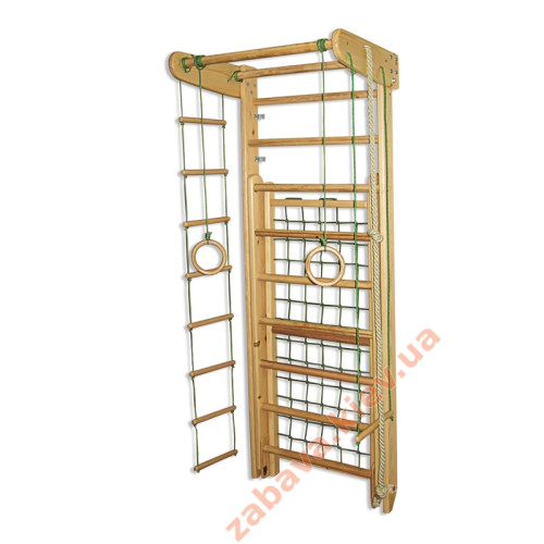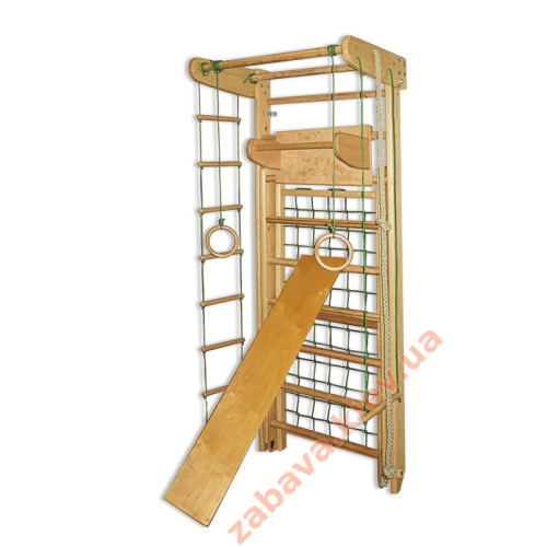 шведская стенка-трансформер, веревочный набор (гимнастические кольца, канат, трапеция, веревочная лесенка), турник и доска.