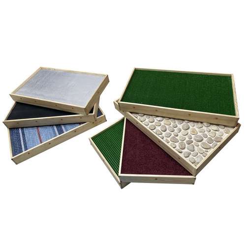 В набор входит 7 прямоугольных элементов. Каждая деталь имеет деревянную основу и различные тактильные покрытия. Модули можно сложить на платформу с колесиками, поэтому их удобно перемещать в помещении.
