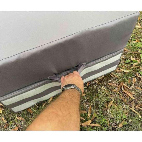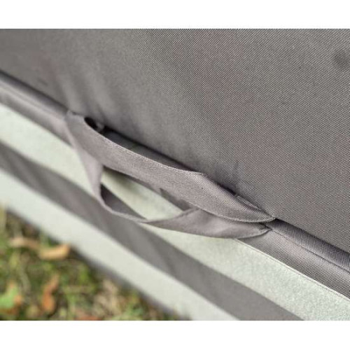 На пуфе разработана система крепления к кровати спереди и по бокам. А еще две части пуфа также соединяется между собой, чтобы исключить возможность их заезда в сторону.