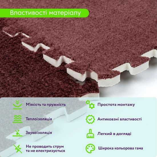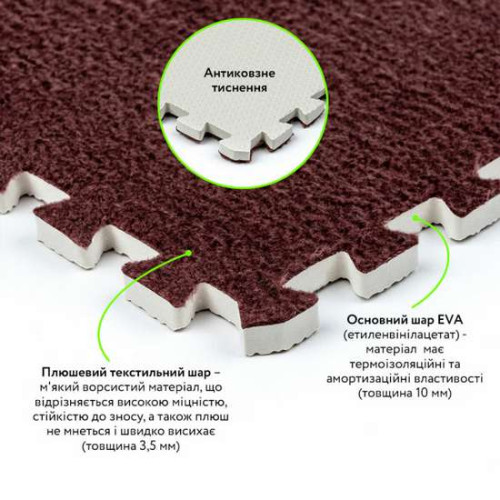 - Теплоизоляционные свойства. Комбинирование плюша и EVA эффективно удерживает тепло, что делает пазлы отличным выбором для напольного покрытия в помещениях, где важно сохранять комфортную температуру. Это свойство также способствует энергосбережению, снижая затраты на отопление.
