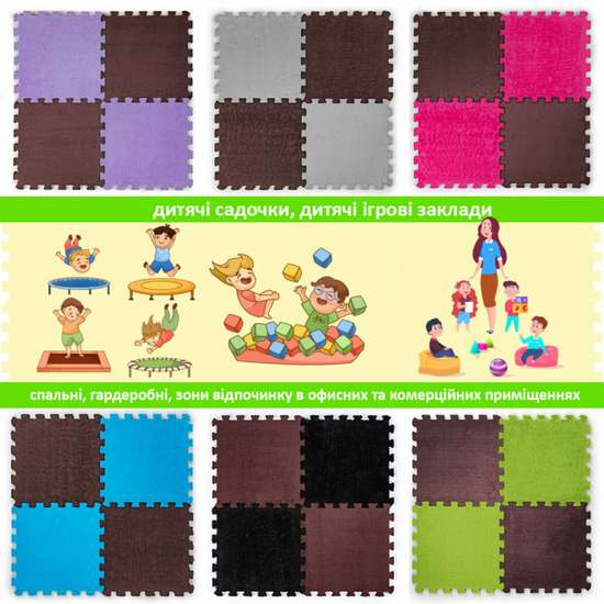 Применение: Пазлы плюшевые предназначены для укладки напольного покрытия в жилых помещениях (гостиная, спальня или детская, кухня и санузел) и в коммерческих помещениях (детские сады, детские игровые заведения, студии и кружки, школы).