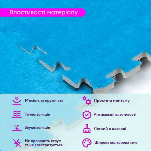 - Теплоизоляционные свойства. Комбинирование плюша и EVA эффективно удерживает тепло, что делает пазлы отличным выбором для напольного покрытия в помещениях, где важно сохранять комфортную температуру. Это свойство также способствует энергосбережению, снижая затраты на отопление.
