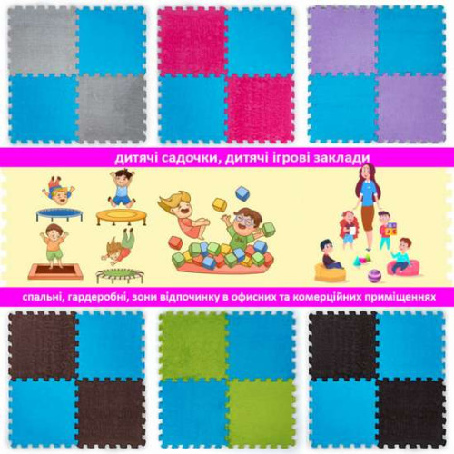 Применение: Пазлы плюшевые предназначены для укладки напольного покрытия в жилых помещениях (гостиная, спальня или детская, кухня и санузел) и в коммерческих помещениях (детские сады, детские игровые заведения, студии и кружки, школы).