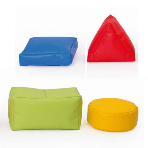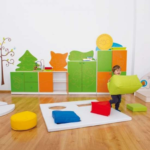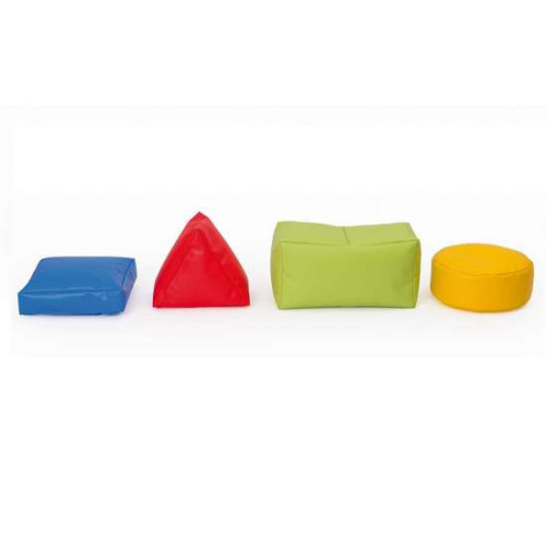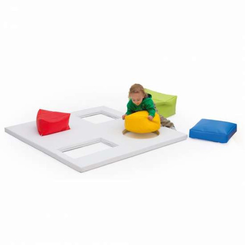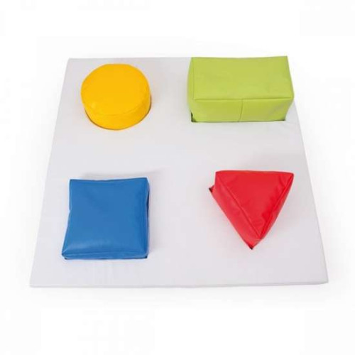Мягкий мат с белой обивкой и вырезанными отверстиями в форме четырех основных фигур: квадрата, круга, треугольника и прямоугольника. Подобрать к ним мягкие пуфы, наполненные гранулами пенополистирола – задача маленьких пользователей. Каждый пуф имеет разную форму, цвет и высоту, поэтому найти для него место на коврике – настоящее удовольствие!