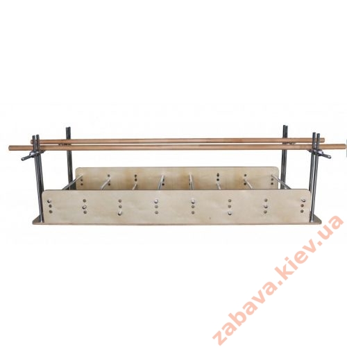 Данная модель изготовлена из материалов высокого качества - металла и фанеры. Состоят из двойных параллельных горизонтальных перил, которые установлены на вертикальных стойках. Стойки регулируются по высоте и ширине.