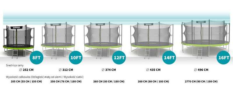 Оскільки батути ZIPRO бувають п'яти розмірів, ви можете легко вибрати той, який найкраще відповідає вашим потребам та кількості місця, виділеного для його встановлення. Незалежно від розміру, який ви оберете, ви можете бути впевнені, що кількість пружин у кожному батуті ZIPRO забезпечує високу потужність відскоку, а стрибки будуть динамічними та принесуть масу задоволення.