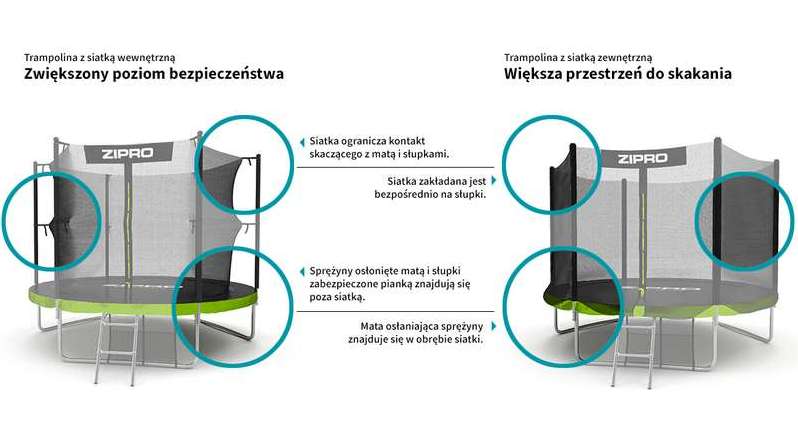 У батутах із зовнішньою сіткою сітка розміщується безпосередньо на стійках, а мат, що захищає пружини, знаходиться усередині сітки. Це рішення забезпечує більше місця для стрибків та ігор, але вимагає трохи кращого контролю над тілом під час стрибків.