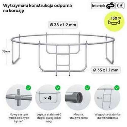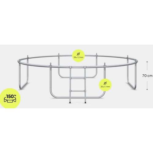 Каркас батута виготовлений з оцинкованої сталі для захисту елементів від погодних умов. Труби рами мають діаметр 38 мм і товщину стінки 1,2 мм.