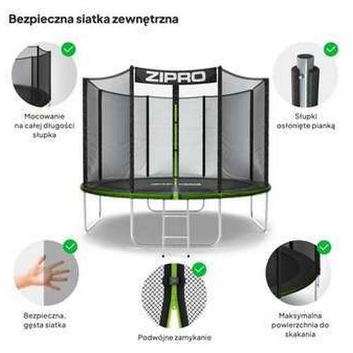 Батут ZIPRO JumpPro OUT із зовнішньою сіткою створений, щоб стати джерелом безтурботного задоволення для користувачів. Він дуже простий у складанні та надзвичайно міцний, тому витримує навіть тривале та інтенсивне використання.