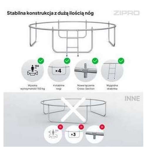 Батути ZIPRO мають збільшену кількість ніжок порівняно з іншими виробами. Таким чином, сили, що діють на конструкцію під час стрибків, краще розподіляються, а навантаження є рівномірним, що забезпечує стабільність і безпеку. Вони виготовлені, як і каркас, з атмосферостійкої оцинкованої сталі.