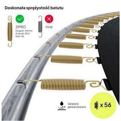 Батут ZIPRO JumpPro побудований з використанням 56 щільно скручених пружин довжиною 145 мм, виготовлених з дроту товщиною 3,1 мм. Правильна кількість і розташування забезпечує сильний відскок і дуже хорошу амортизацію під час приземлення.