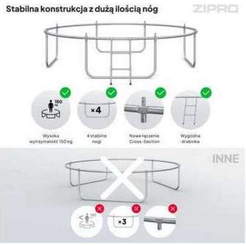 Батут ZIPRO Jump Pro PREMIUM був розроблений, щоб стати джерелом безтурботного задоволення для користувачів. Він дуже простий в установці і надзвичайно міцний, тому не боїться навіть тривалого та інтенсивного використання.